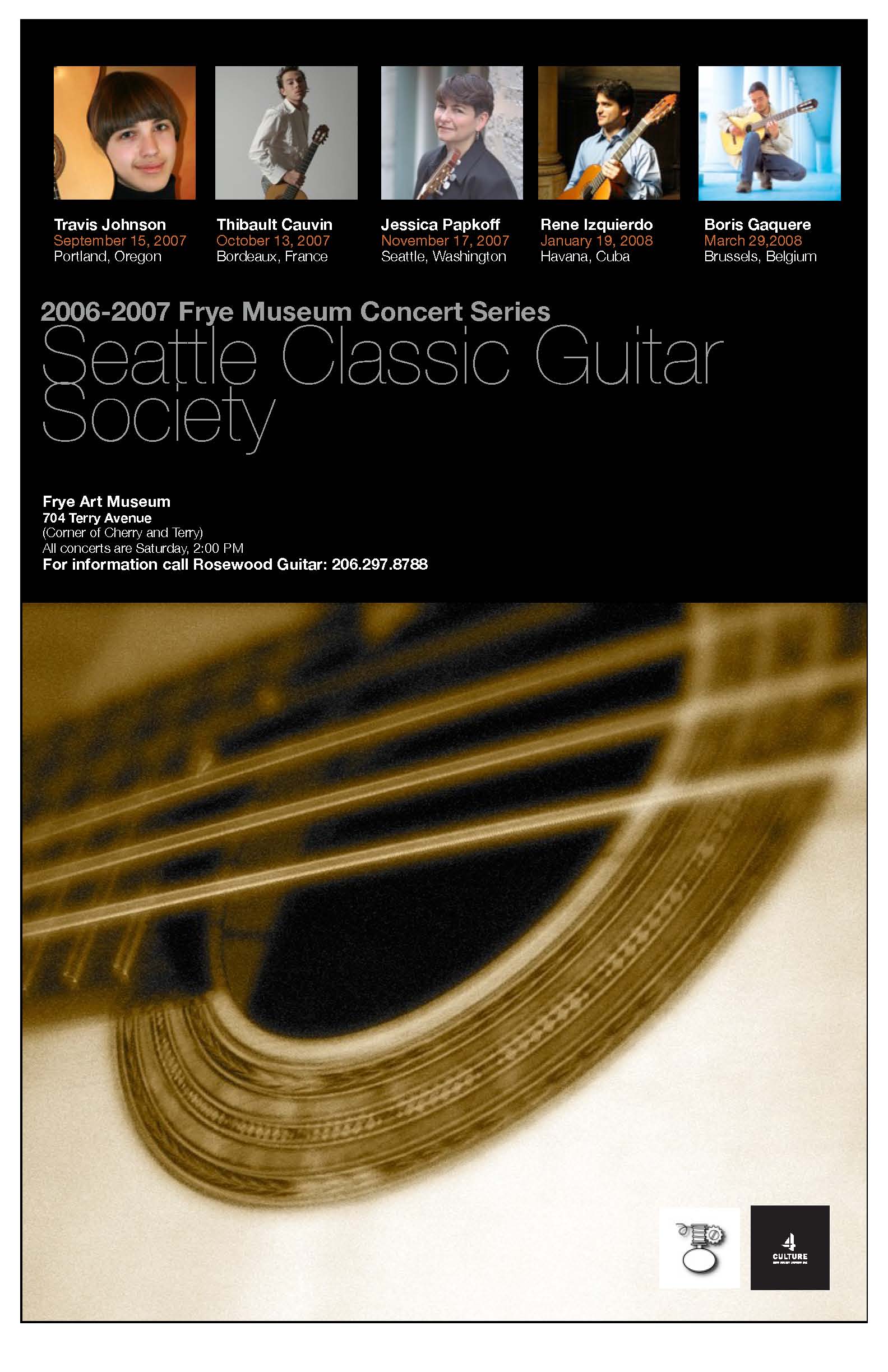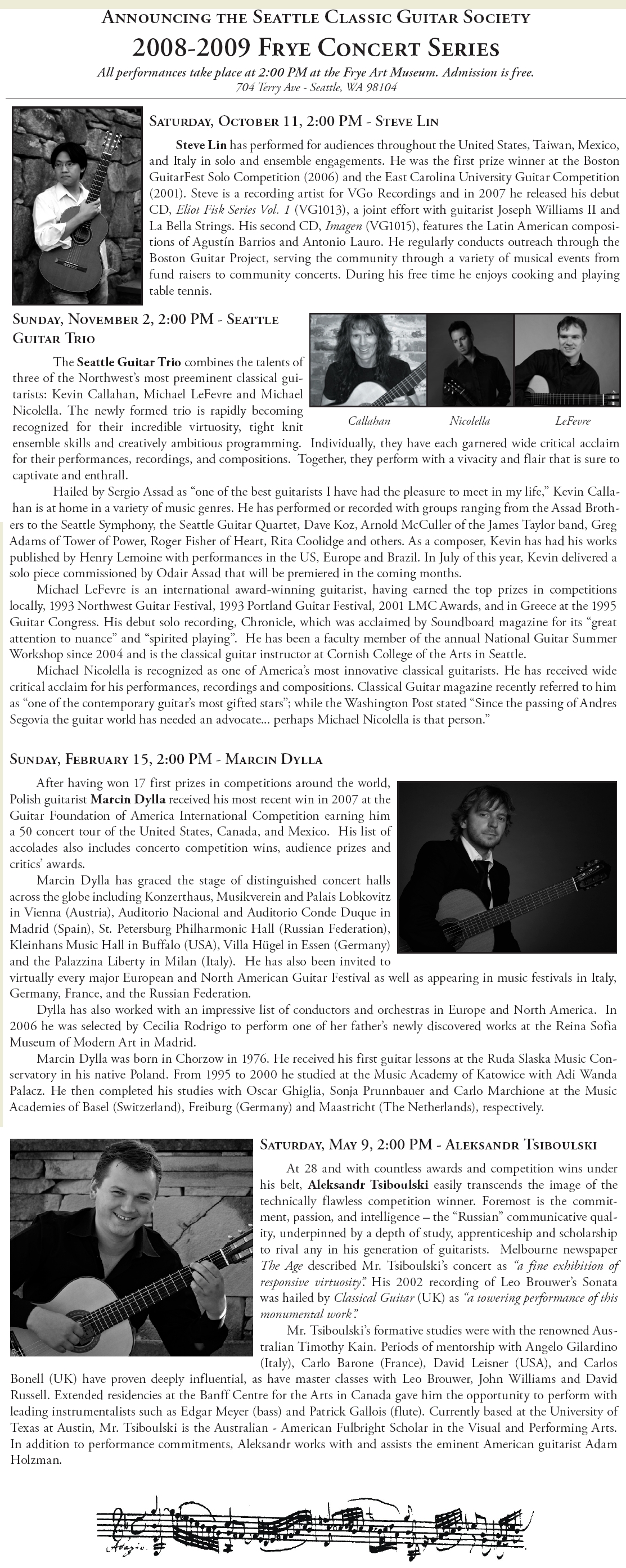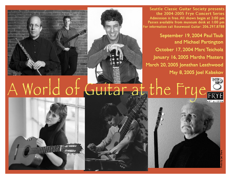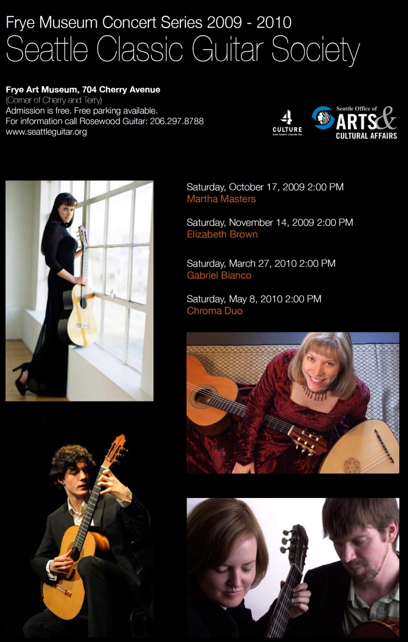 2024-2025 (Good Shepherd Center Concert Series): Michael Yolleck - January 11, 2025 Seattle Eastside Guitar Ensemble - February 8, 2025 Melissa Schiel & Tamara Caulkins - March 15, 2025 Naeim Rahmani - May 31, 2025 2023-2024 (Good Shepherd Center Concert Series): Stella Kosim - September 9, 2023 David Feingold - February 10, 2024 Christopher Mallet - April 13, 2024 Aaron Haass - May 18, 2024 Connie Sheu - June 1, 2024 Maximilliano Larra - July 31, 2024 2022-2023 (Good Shepherd Center Concert Series): Caulkins Guitar Duo - April 30, 2022 David Tutmark - November 12, 2022 Gabriele Leite - March 4, 2023 Eli Schille Hudson - June 10, 2023 2019-2020 (Frye Art Museum Concert Series): Jiji: October 26, 2019 Paul Grove: November 30, 2019 Michael Kudirka: February 15, 2020 Jon Yerby: May 9, 2020 (Facebook Live) 2018-2019: Mark Wilson: October 13, 2018 Pacific Duo: January 12, 2019 Irina Kulikova: April 13, 2019 James Kline: May 18, 2019 2017-2018: Alan Liu: March 31, 2018 Gaëlle Solal: February 17, 2018 South Hill Guitars: November 11, 2017 Scott Kritzer: October 21, 2017 2016-2017: Lily Afshar: April 22, 2017 Marc Teicholz: February 11, 2017 Martha Masters: January 28, 2017 Travis Johnson: October 22, 2016 2015-2016: Connie Sheu: April 9, 2016 Isaac Bustos: January 16, 2016 Michael and Keleren Millham: November 28, 2015 Daniel Bolshoy: October 17, 2015 2014-2015: Thibault Cauvin: March 14, 2015 Yovianna Garcia Alvarado: January 17, 2015 Jesse McCann: November 29, 2014 Antoniy Kakamakov: October 25, 2014 2013-2014: Hilary Field: May 10, 2014 Laura Husbands: March 8, 2014 Dieter Hennings: November 30, 2013 James Reid: October 26, 2013 2012-2013: Jeffrey McFadden: May 11, 2013 Gohar Vardanyan: February 16, 2013 Daniel Corr: November 17, 2012 Rene Izquierdo: October 27, 2012 2011-2012: Michael LeFevre: April 31, 2012 Janet Grohovac: February 25, 2012 Oregon Guitar Quartet: October 29, 2011 2010-2011: Lynn McGrath: April 16, 2011 Duo Rubicund: February 12, 2011 Jon Mendle: January 29, 2011 Isaac Bustos: November 13, 2010 2009-2010: (view poster) Chroma Guitar Duo: May 8, 2010 Gabriel Bianco: March 27, 2010 Elizabeth Brown: November 14, 2009 Martha Masters: October 17, 2009 2008-2009: (view poster) Gyan Riley: May 9, 2009 Marcin Dylla: February 15, 2009 Seattle Guitar Trio: November 2, 2008 Steve Lin: October 11, 2008 2007-2008: (view poster) Boris Gaquere: March 29, 2008 Rene Izquierdo: January 19, 2008 Jessica Papkoff: November 17, 2007 Thibault Cauvin: October 13, 2007 Travis Johnson: September 15, 2007 2006-2007: Steve Kostelnik: April 28, 2007 Jason Williams: February 24, 2007 Alexander Dunn: October 21, 2006 Douglas James: September 16, 2006 2005-2006: Andrew Zohn: May 13, 2006 Tristan Bligh: March 11, 2006 William Kanengiser: February 11, 2006 Elizabeth Brown & Kim Pineda: September 10, 2005 2004-2005: (view poster) Joel Kabakov: May 8, 2005 Jonathan Leathwood: March 20, 2005 Martha Masters: January 16, 2005 Marc Teicholz: October 17, 2004 Michael Partington & Paul Taub: September 19, 2004 2003-2004: Nuccio D'Angelo: May 2, 2004 Brouwer Guitar Quartet: March 7, 2004 Randall Avers: January 18, 2004 Dimitri Illarionov: October 19, 2003 Michael LeFévre: September 14, 2003 2002-2003: Benzant-Kudirka Duo: March 9, 2003 Daniel Corr: January 12, 2003 Daniel Bolshoy: November 3, 2002 Canadian Guitar Trio: Harold Micay, Hanh Nguyen & Zach Westfall: September 22, 2002 |