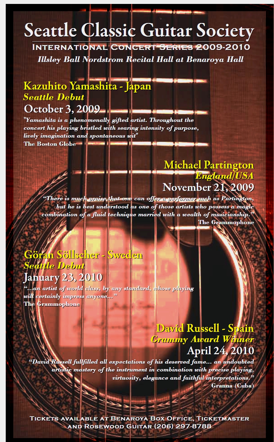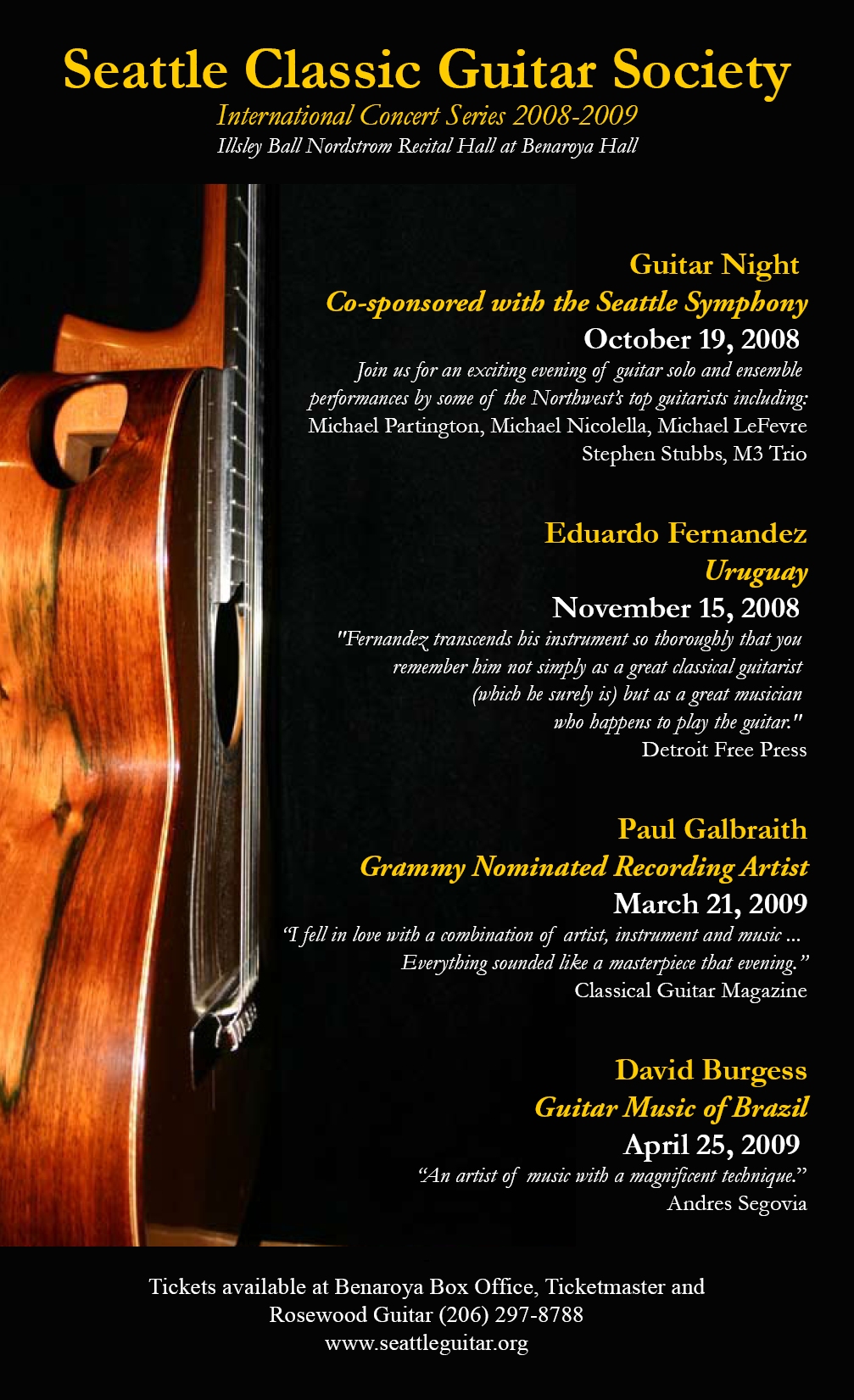 Jorge Caballero - September 28, 2024 Iliana Matos - November 16, 2024 Los Angeles Guitar Quartet - April 5, 2025 Berta Rojas - May 3, 2025 2023-2024: Stephanie Jones - September 30, 2023 Ana Vidovic - November 11, 2023 Benjamin Verdery - March 16, 2024 Manuel Barrueco - May 4, 2024 2022-2023: Meng Su - October 15, 2022 René Izquierdo - November 19, 2022 David Russell - March 11, 2023 Brasil Guitar Duo - May 6, 2023 2019-2020: Berta Rojas: September 21, 2019 Duo Melis: November 9, 2019 Michael Partington: March 23, 2020 (cancelled) Judicaël Perroy: May 2, 2020 (cancelled) 2018-2019: Iliana Matos: September 22, 2018 Eduardo Fernández and David Leisner Guitar Duo: November 10, 2018 David Russell: March 23, 2019 Zoran Dukic - May 4, 2019 2017-2018: Jéremy Jouve: May 5, 2018 Xuefei Yang: March 3, 2018 Brasil Guitar Duo: November 18, 2017 Matt Palmer: September 23, 2017 2016-2017: Antigoni Goni: May 6, 2017 Michael Partington: March 4, 2017 Los Angeles Guitar Quartet: November 19, 2016 Thibault Cauvin: September 24, 2016 2015-2016: Jason Vieaux: May 14, 2016 David Russell: March 5, 2016 Duo Melis: November 14, 2015 Jorge Caballero: September 26, 2015 2014-2015: Marcin Dylla: May 2, 2015 Amadeus Duo: March 7, 2015 Ana Vidovic: November 8, 2014 Roland Dyens: September 27, 2014 2013-2014: Vladimir Gorbach: April 26, 2014 Berta Rojas: February 22, 2014 Katona Twins: November 9, 2013 Andrew York: September 28, 2013 2012-2013: Ben Verdery: April 27, 2013 David Russell: February 23, 2013 Michael Partington: November 10, 2012 Xuefei Yang: September 29, 2012 2011-2012: The Paris Guitar Duo: April 20, 2012 Odair Assad: March 2, 2012 Fabio Zanon, November 12, 2011 David Leisner: September 24, 2011 2010-2011: Marcin Dylla: May 7, 2011 Duo Melis: March 12, 2011 Michael Nicolella: December 4, 2010 Jorge Caballero: October 2, 2010 2009-2010: (view poster) David Russell: April 24, 2010 Göran Sollscher: January 23, 2010 Michael Partington: November 21, 2009 Kazuhito Yamashita: October 3, 2009 2008-2009: (view poster) David Burgess: April 25, 2009 Paul Galbraith: March 21, 2009 Eduardo Fernandez: November 15, 2008 Michael Lefevre, Michael Nicolella, Michael Partington & Stephen Stubbs: October 19, 2008 2007-2008: (view poster) Judicael Perroy: April 19, 2008 Xuefei Yang: February 16, 2008 Stephen Stubbs: October 27, 2007 Jason Vieaux: September 22, 2007 2006-2007: Adam Holzman: March 24, 2007 The Minneapolis Guitar Quartet: January 20, 2007 Michael Partington: November 18, 2006 David Russell: September 30, 2006 2005-2006: Michael Nicolella: March 18, 2006 The Katona Twins: January 28, 2006 Adam del Monte: October 29, 2005 Jorge Caballero: September 24, 2005 2004-2005: Stanely Yates: May 21, 2005 Eduardo Fernandez: March 26, 2005 Anna Vidovic: October 30, 2004 The Los Angeles Guitar Quartet: September 25, 2004 2003-2004: David Russell: May 8, 2004 David Tanenbaum: March 27, 2004 Steven & John Novacek: January 31, 2004 Michael Partington: November 1, 2003 Paul Galbraith: September 20, 2003 2002-2003: Dale Kavanagh: March 28, 2003 The Brazilian Guitar Quartet: January 25, 2003 Paul O'Dette: November 16, 2002 Eliot Fisk: October 5, 2002 2001-2002: David Russell: April 27, 2002 The Los Angeles Guitar Quartet: February 9, 2002 Roland Dyens: November 3, 2001 Manuel Barrueco: September 28, 2001 1998-2001: Artists included: The Los Angeles Guitar Quartet, John and Steven Novacek, Michael Partington, Antigoni Goni, Eduardo Fernandez, and Daid Russell. |